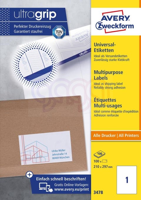 Etykiety uniwersalne 3478 210 x 297 100 ark. Trwałe, białe Avery Zweckform