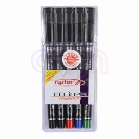 Foliopis Permanentny Rystor___ wodoodporny___ idealny do pisania na prawie wszystkich powierzchniach_gładkich (szkło, plastik, metal, porcelana, folia, płyty __CD/DVD itp.)___ zaopatrzony w szybkoschnący, nie rozmazujący się tusz,_odporny na działanie promieni słonecznych___ charakteryzuje się dużą intensywnością barw_i wyrazistością konturów___ foliopis może być pozostawiony bez zatyczki przez wiele_dni _ nie zaschnie___ korek w nasadce i obudowie określa kolor tuszu___ w każdej grubości dostępny w zestawach 5 szt. (4 kolory:_czarny, czerwony, niebieski, zielony) + dodatkowy czarny_GRATIS___ jednostka sprzedaży 1 sztuka lub 1 komplet