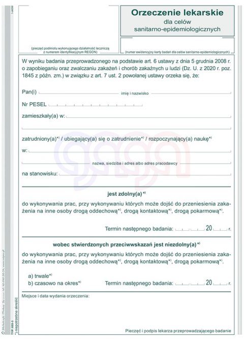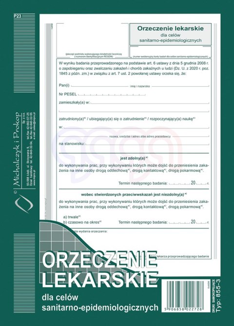 855-3 Orzeczenie lekarskie z badania przeprowadzonego do celów sanitarno-epidemiologicznych 855-3