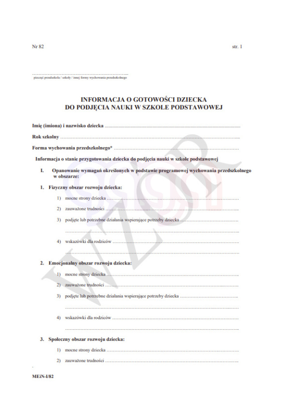 INFORMACJA O GOTOWOŚCI DZIECKA DO PODJĘCIA NAUKI W SZKOLE PODSTAWOWEJ MEIN-I/82