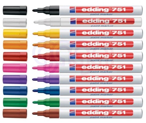 Marker lakierowy Edding 751_- marker lakierowy przeznaczony do wykonywania trwałych oznaczeń na niemal każdej powierzchni, także porowatej_- tusz pigmentowy, dobrze kryjący i wysoce nieprzezroczysty, wodoodporny i szybkoschnący, odporny na ścieranie, odporny na działanie temperatury do 400_C (kolory: biały, żółty i srebrny do 1000_C)_- tusz o nieagresywnym zapachu i kryciu zbliżonym do lakieru, nie zawiera toluenu i ksylenu_- marker posiada system kontroli dopływu tuszu do końcówki_- aluminiowa obudowa_- okrągła końcówka_- grubość linii pisania: 1-2 mm (751)_- jednostka sprzedaży 1 sztuka