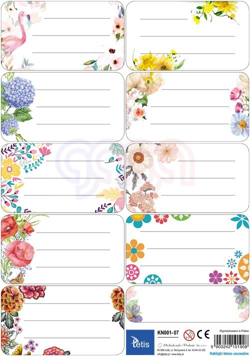 Naklejki na zeszyty i książki - łatwo usuwalne. Na arkuszu znajduje się 9 etykiet. 25 arkuszy w zestawie.