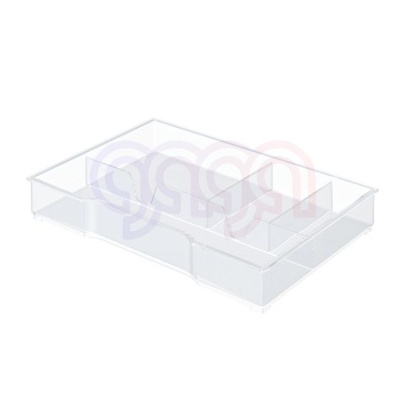 Uzyskaj doskonale zorganizowaną szufladę dzięki użytecznemu dodatkowi w przezroczystym kolorze z wykończeniem na wysoki połysk. __ Zaprojektowany do małych i dużych szuflad pojemników z szufladami Plus i WOW __ 4 przegródki do uporządkowania małych przedmiotów takich, jak długopisy, karteczki do notatek, wizytówki, pamięci USB, spinacze itp.__ Przezroczysty, błyszczący wygląd z teksturą na dnie oraz grawerowanymi symbolami pokazującymi możliwe opcje przechowywania dla każdej przegródki_ _ Stopery na spodzie organizera zapobiegają ślizganiu