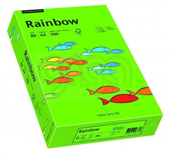 Papier kolorowy Rainbow ciemno zielony 78_Wysokiej jakości, kolorowy papier, bezdrzewny, barwiony w masie, o szerokim wachlarzu kolorystycznym. Zalecany do wydruków faksowych, korespondencji oraz zaproszeń i ulotek. Pakowany w eleganckie przezroczyste opakowanie. A4 80 g kolor intensywny_- jednostka sprzedaży 1 ryza