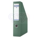 Wykonany z tektury o grubości 2,1mm pokrytej ekologiczną folią polipropylenową (100_m) o strukturze płótna_posiada Zielony Punkt (Der Gr_ne Punkt) - udział w systemie recyklingu i odzysku odpadów wynikający z przepisów prawa polskiego i UE_okładzina wewnętrzna: biały offset 90-100g_szerokość grzbietu: 75mm_pojemność: do 750 kartek o gramaturze 80gsm_odpowiada jakością segregatorom - po ustawieniu na półce, nie do odróżnienia od klasycznych segregatorów_posiada wycięcie na palec do wygodnego wkładania / zdejmowania pojemnika z półki_zawiera wymienną etykietę grzbietową_składany _ bardzo prosty w montażu_wymiary: 75x320x245mm_kolor zielony