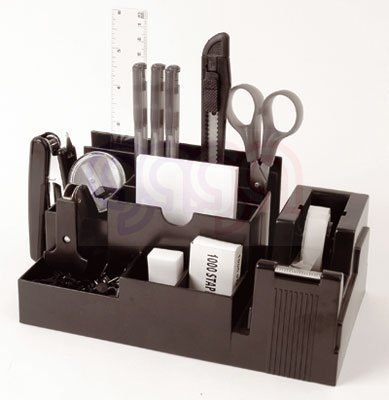Przybornik Eagle 330 Przybornik na biurko z wbudowanym uchwytem do taśmy z obcinaczem. Wykonany z trwałego tworzywa w kolorze czarnym. Zawiera wyposażenie składające się z 13 elementów : zszywacz, rozszywacz, nożyczki, nóż do papieru, temperówka, linijka 15 cm, gumka do ścierania, długopisy (3 szt.), pinezki tablicowe (20 szt.), spinacze (30 szt.), zszywki _10 (1 op.), notes 2,5x3,5, taśma klejąca 12x10.