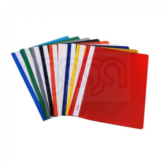 Wykonanay z twardej folii,przednia okładka przezroczysta, tylna kolorowa, wyposażony w wysuwany, papierowy pasek do opisu, zaokrąglone rogi obu okładek, jednostka sprzedaży 1 opakowanie (10 sztuk).