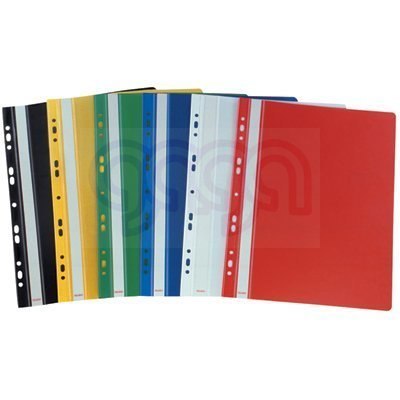 Wykonanay z twardej folii,przednia okładka przezroczysta, tylna kolorowa, wyposażony w wysuwany, papierowy pasek do opisu, zaokrąglone rogi obu okładek, posiada boczną perforację umożliwiającą wpięcie do segregatora z dowolnym ringiem, jednostka sprzedaży 1 opakowanie (10 sztuk).