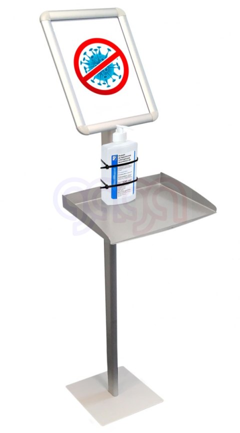 Stojak z ramką plakatową zatrzaskową i półką np. na płyn dezynfekcyjny.