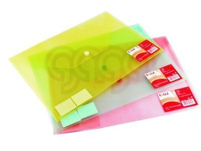 Teczka kopertowa na dokumenty, zamykana na zatrzask. Wykonana z wytrzymałego, półprzezroczystego tworzywa w różnych kolorach. Występuje w formacie A4.
