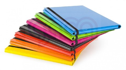 Wykonana z twardej 2mm tektury powleczonej folią PP. Posiada czarną wyklejkę z wysokiej jakości surowca. Zamykana na gumkę. Szerokość grzbietu do 20 mm. Innowacyjna gama kolorystyczna.