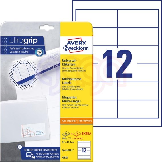 | Katalog_2020naz | Etykiety uniwersalne A4 25 arkuszy + 5 arkuszy Extra 97 x 423 mm białe Avery Zweckform |