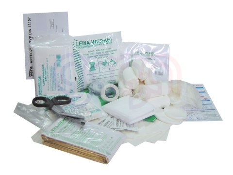 -Vera wyposażenie apteczki DIN 13157 plus - skład wyposażenia: kompres zimny, 2 kompresy na oko, 3 kompresy 10x10cm pakowane po 2 szt., 2 opaski elastyczne 4mx6cm, 2 opaski elastyczne 4mx8cm, 8 plastrów 10x6 cm, zestaw plastrów 20 szt., przylepiec 5mx2,5 cm, opatrunek indywidualny G, 3 opatrunki indywidualne M, opatrunek indywidualny K,chusta opatrunkowa 60x80 cm, 2 szt chusta trójkątna, chusta z fiseliny 5 szt., koc ratunkowy 160x210 cm, nożyczki 19 cm, 4 szt. rękawice winylowe, 2 szt. worek foliowy 30x40 cm, 6 szt. chusta dezynfekująca, ustnik do sztucznego oddychania, instrukcja udzielania pierwszej pomocy wraz z wykazem telefonów alarmowych.