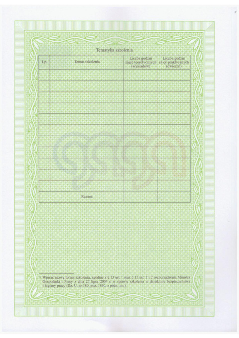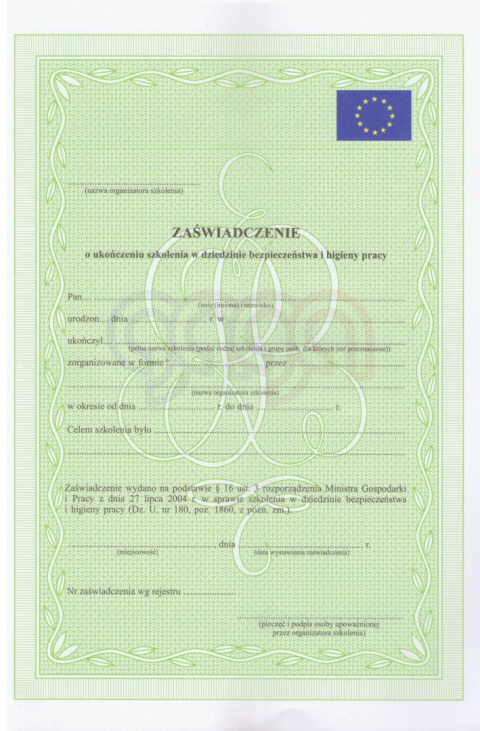 ZAŚWIADCZENIE O UKOŃCZENIU SZKOLENIA BHP Z LOGIEM UNII EUROPEJSKIEJ