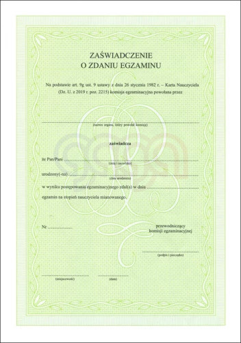 ZAŚWIADCZENIE O ZDANIU EGZAMINU NA STOPIEŃ NAUCZYCIELA MIANOWANEGO
