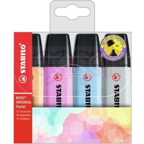 STABILO BOSS ORIGINAL Pastel - prawdziwy klasyk wśród zakreślaczy i niedościgniony wzór! Dostępny jest w 9 kolorach neonowych a także w 14 kolorach pastelowych. Razem aż 23 możliwości do wyboru. Grubość linii od 2 do 5 mm pozwala na zakreślanie tekstów o różnej wielkości. Nadaje się też do pisania, ozdabiania, hand letteringu. Technologia Anti-dry zabezpiecza tusz przed zasychaniem, dzięki czemu można go używać nawet przez 4 godziny i mieć pewność, że nie zaschnie. W trosce o środowisko wszystkie czarne elementy zakreślacza wykonane są z plastiku pochodzącego z recyklingu. Plastikowe etui zawierające 4 szt. zakreslaczy w kolorach subtelny pomarańcz, chłodna fuksja, błękitna bryza i mglisty szary